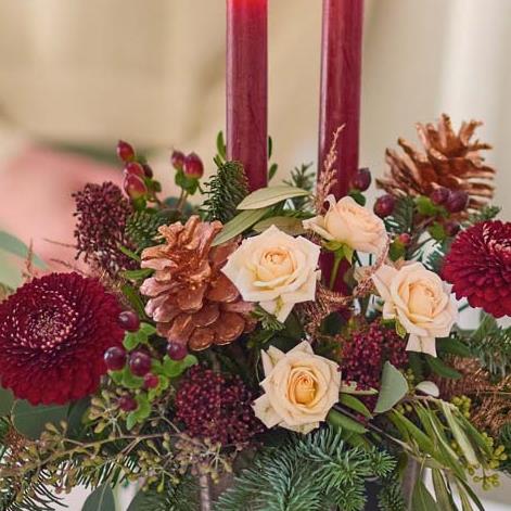 A gorgeous selected of fresh festive flowers, arranged by a florist around a red candle, in a dark copper coloured ceramic bowl.