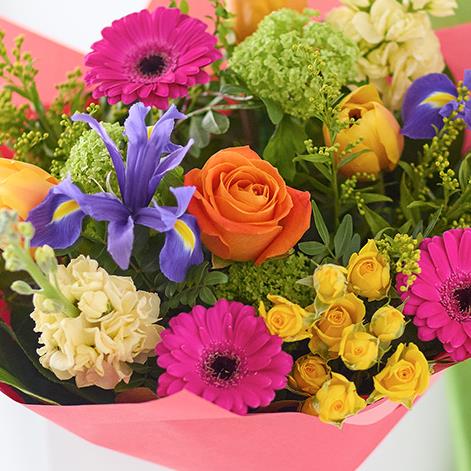 A gorgeous bouquet of vibrant fresh flowers, without any lilies, expertly arranged by a local florist.
