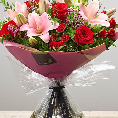 Featuring red large headed roses, pink LA lilies, red spray roses and pink waxflower with salal, pistache and eucalyptus, hand-tied