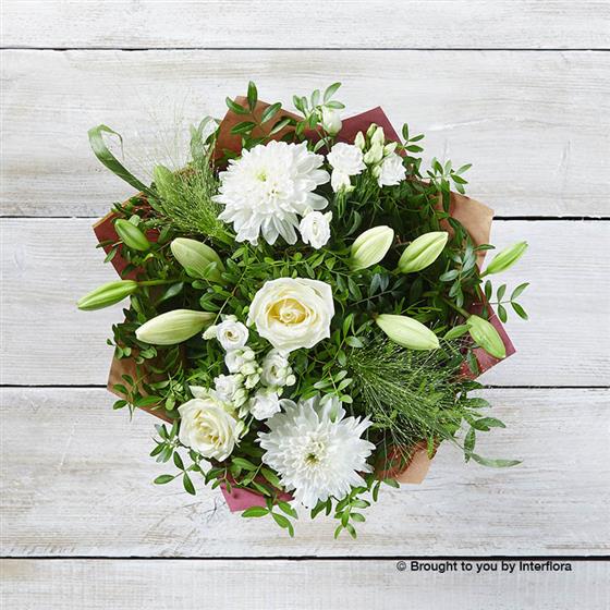 Featuring white large headed roses, white LA lilies, white chrysanthemum blooms and white lisianthus with salal, pistache and panicum grass, hand-tied, wrapped and presented in Interflora gift packaging.