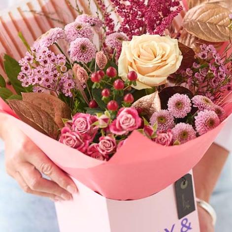 An on trend gift box handcrafted by their local florist featuring blooms in cerise and purple tones, with soft pink, peach or lilac shades. It might also feature dried flowers or foliage painted in copper or rose gold.